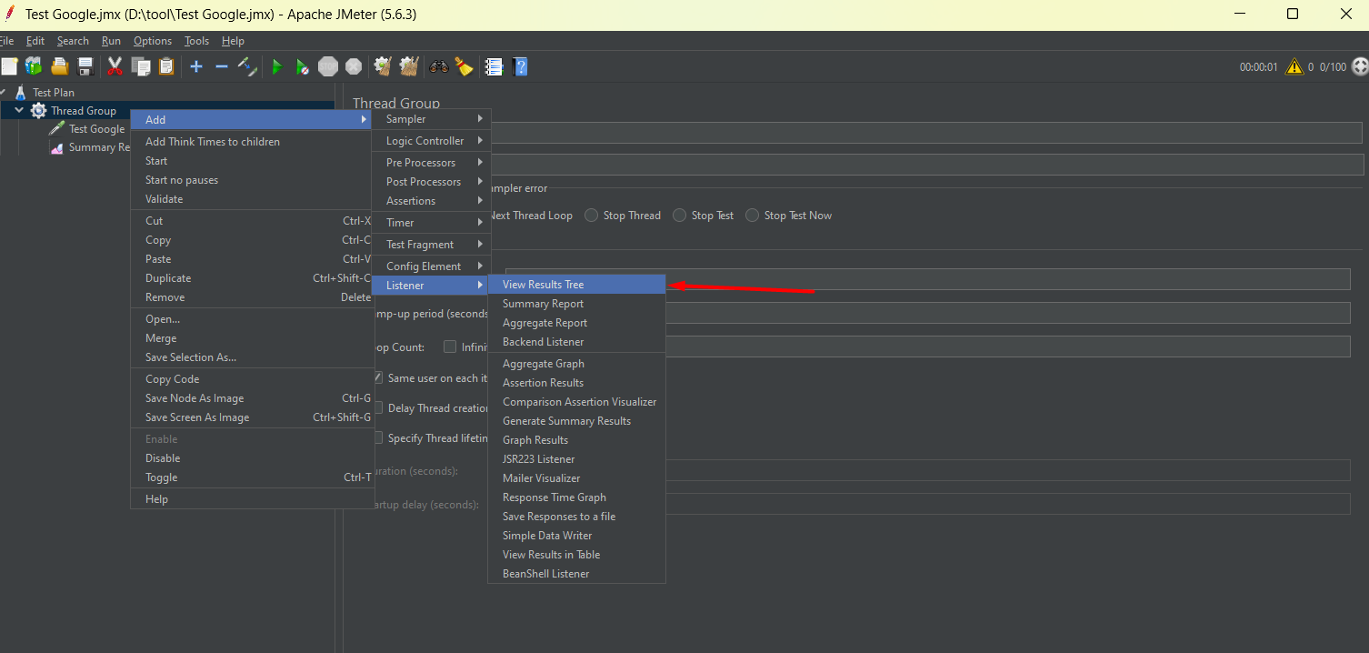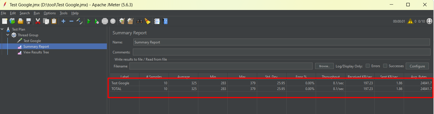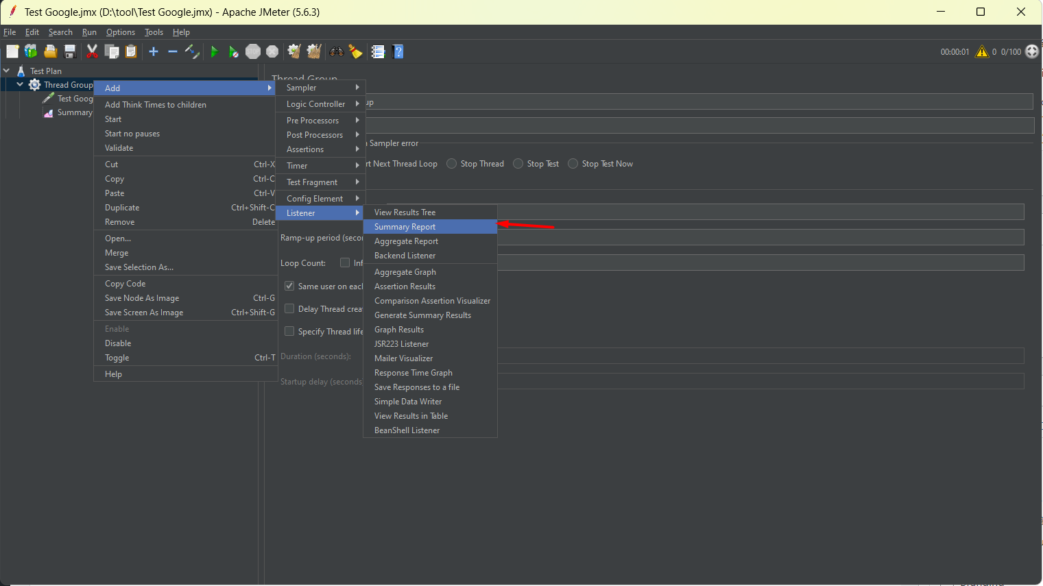 Chuột phải vào Thread Group → Add → Listener → Summary Report.