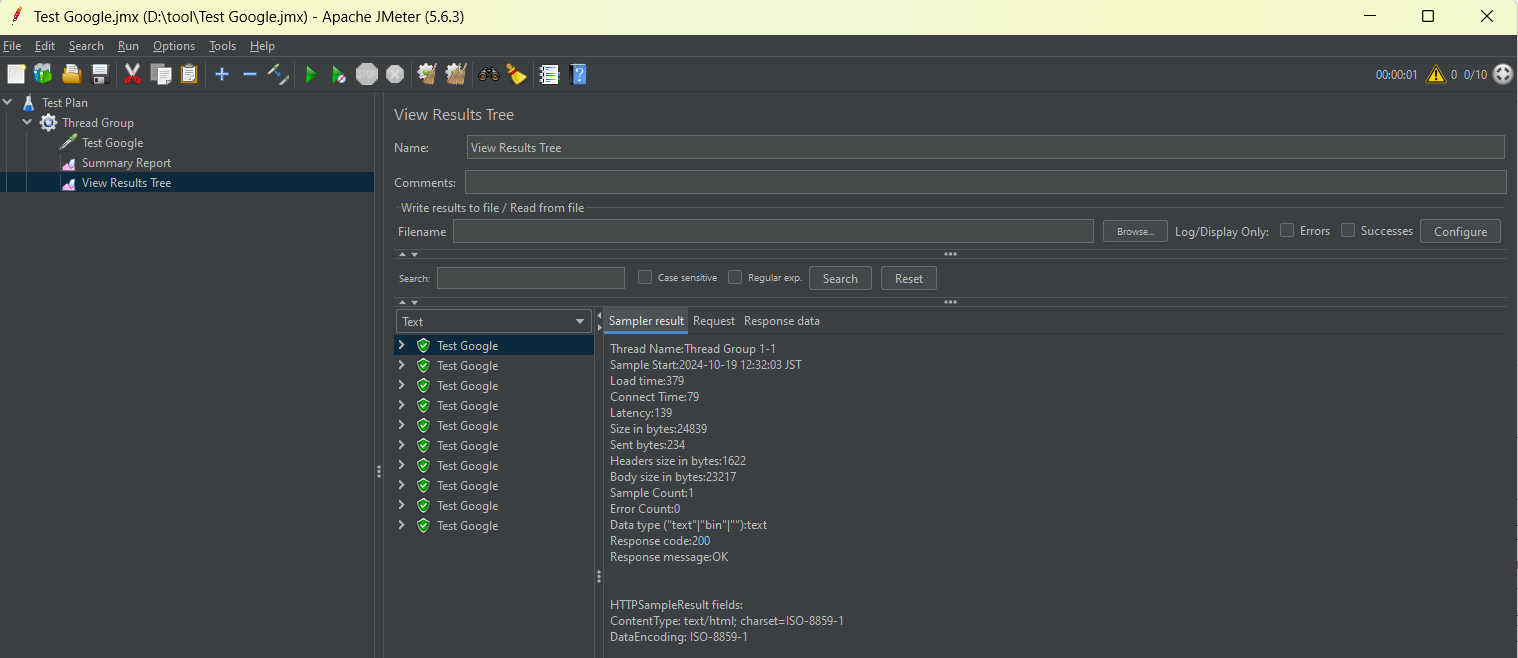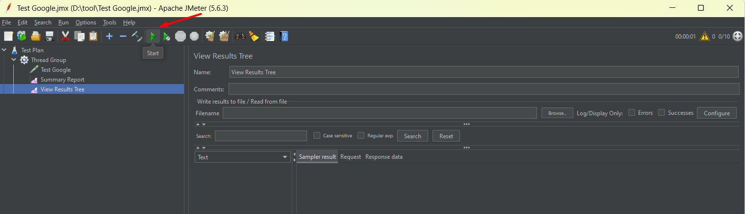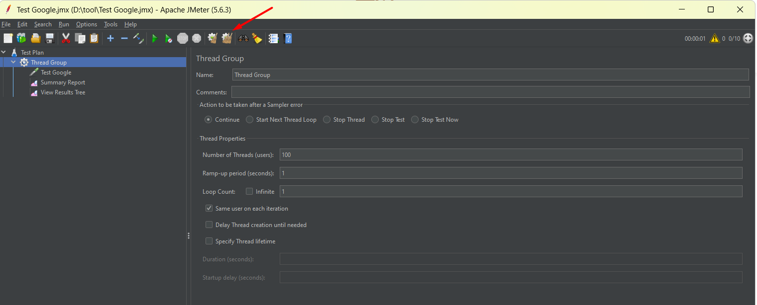 Ở ví dụ test Google lần này sẽ có 10 user thực hiện request trong cùng 1 giây và thực hiện 1 lần duy nhất.