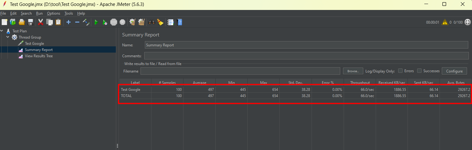 Xóa kết quả đi và chạy lại với Number of Threads (Users) = 100, tức là 100 người thực hiện load trang Google cùng 1 lúc.