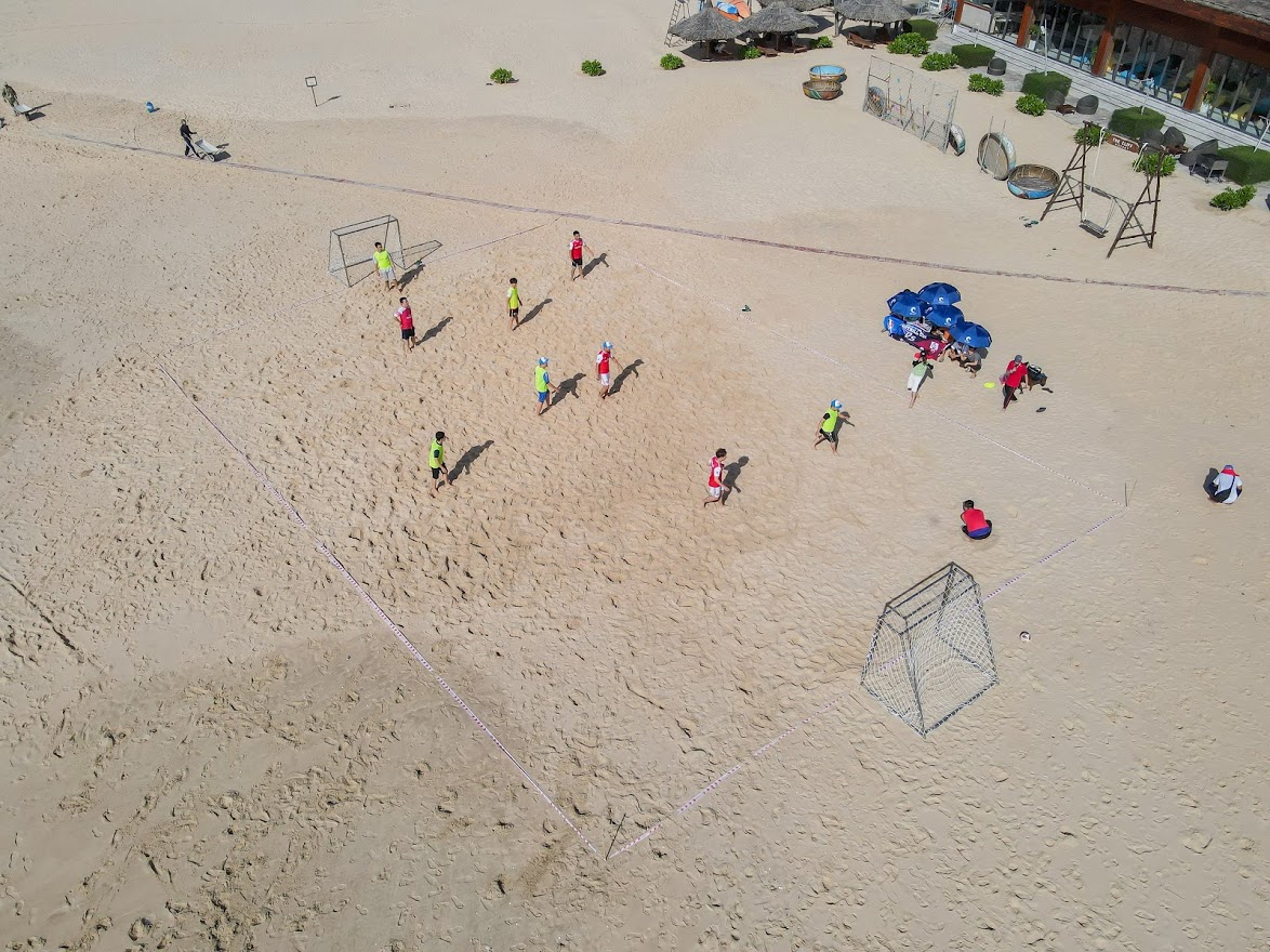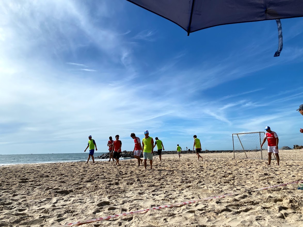 Các cầu thủ không hề e ngại thời tiết biển Phan Thiết ngày nắng gắt, hết mình vì đam mê với trái bóng
