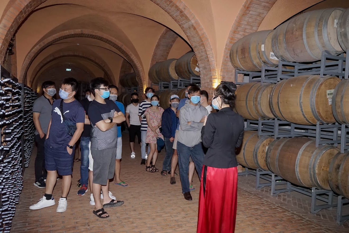 Nhân viên hướng dẫn giới thiệu cho mọi người những thông tin về xuất xứ, quy trình sản xuất rượu vang