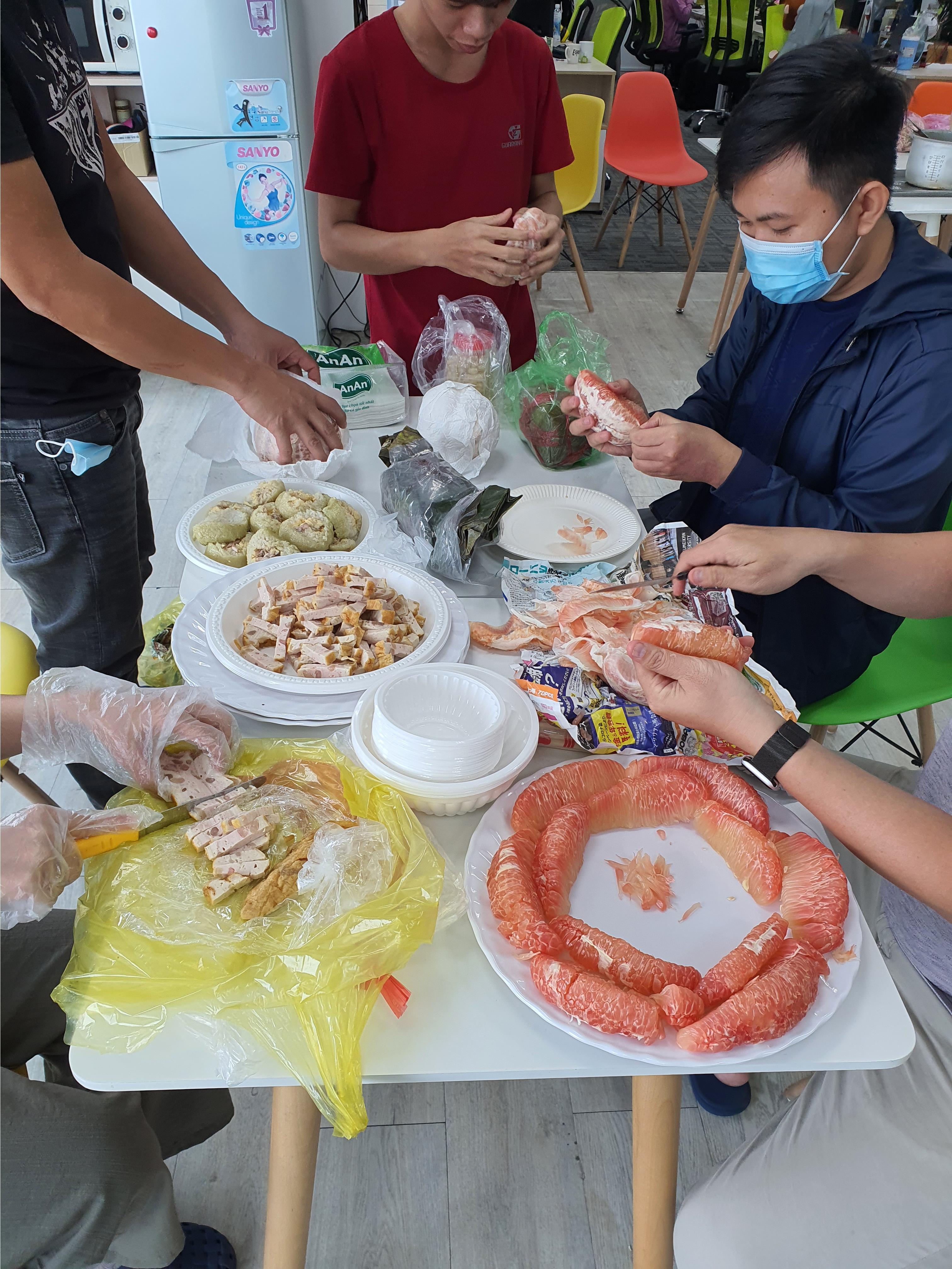 Bữa ăn trưa cuối năm không chỉ để mọi người dùng bữa tiện hơn trong ngày cận kề Tết – khi Sài Gòn bắt đầu vắng dần các hàng quán, các cô bán cơm, các bác bán hủ tiếu đã “bỏ rơi” mọi người để về quê ^^ – mà còn là dịp để mọi người quây quần bên nhau, kể nhau nghe những câu chuyện vui, những kế hoạch trong dịp Tết cận kề. Hơn nữa đây còn là cơ hội để mọi người trao nhau những lời chúc, những lời dặn dò ngắn gọn nhưng đầy sự quan tâm nhau như: “về quê cẩn thận nha”, “đi xe nhớ đeo khẩu trang kỹ vào để tránh cô vy”, “Tết nhớ bảo trọng cân nặng đó nha :’) “,… Các thành viên nhà RCVN miệng cười mà lòng ấm áp, không có mai, không có đào nhưng ai cũng cảm nhận được không khí Tết vui tươi ngập tràn trong văn phòng.