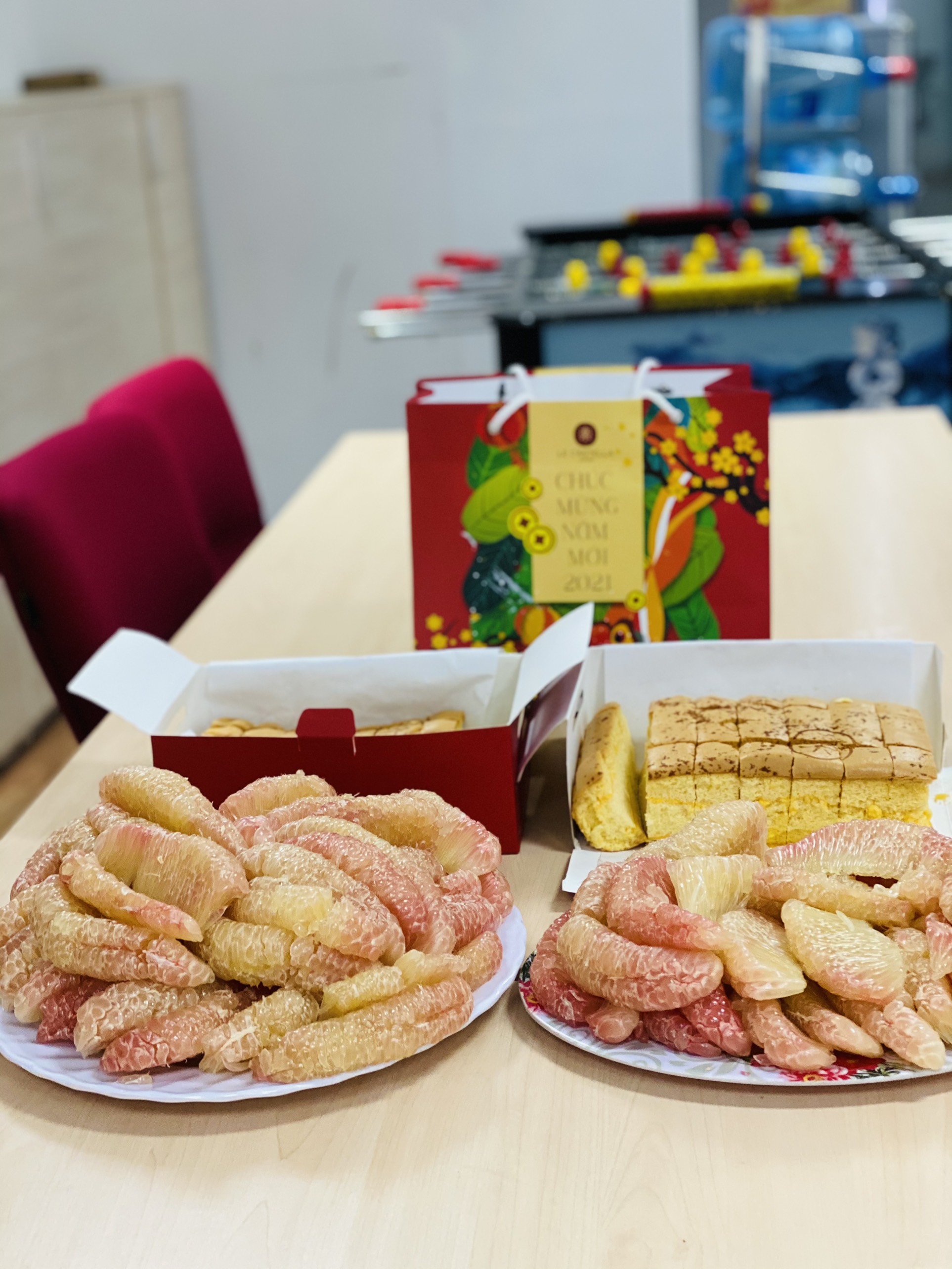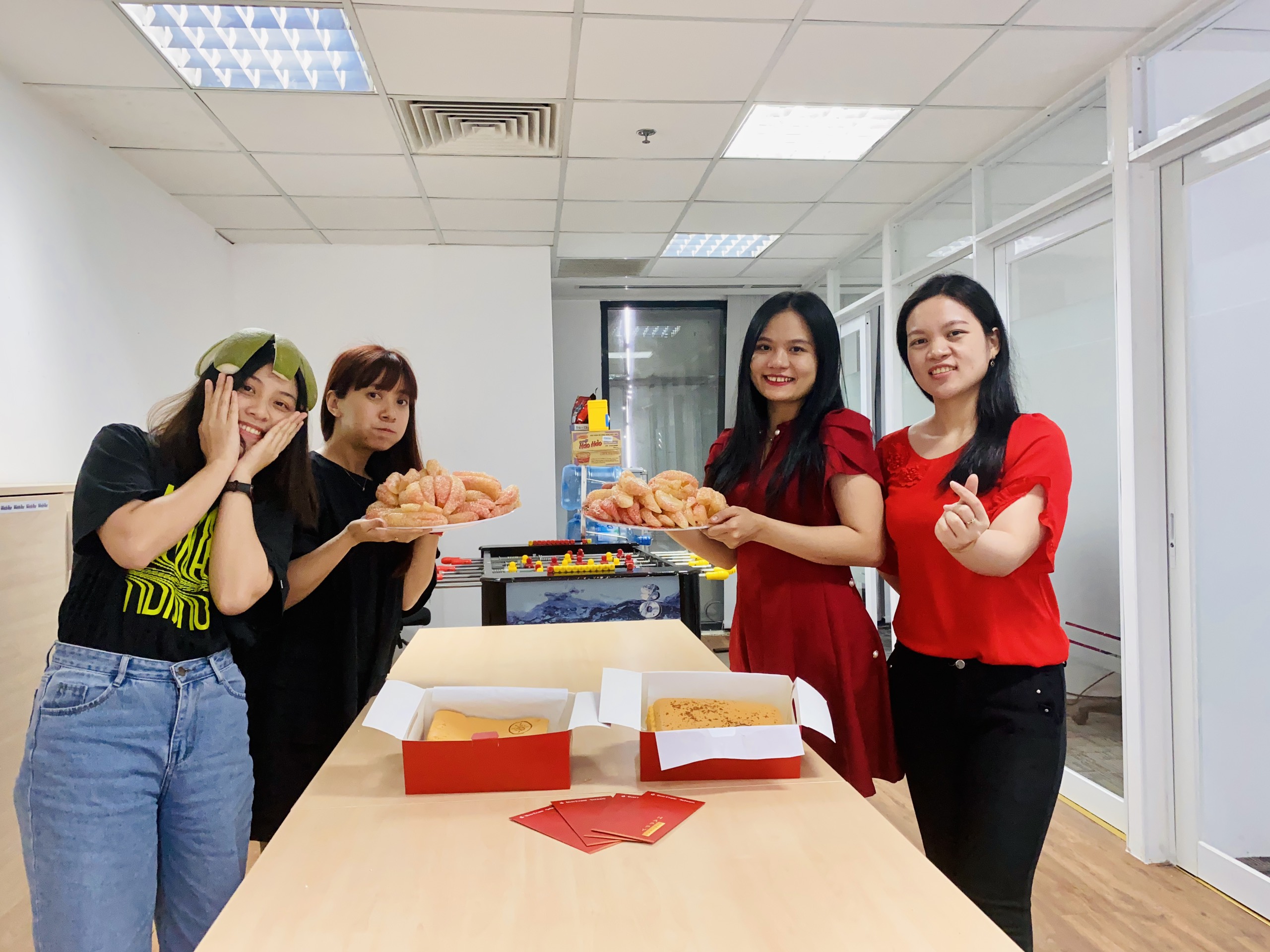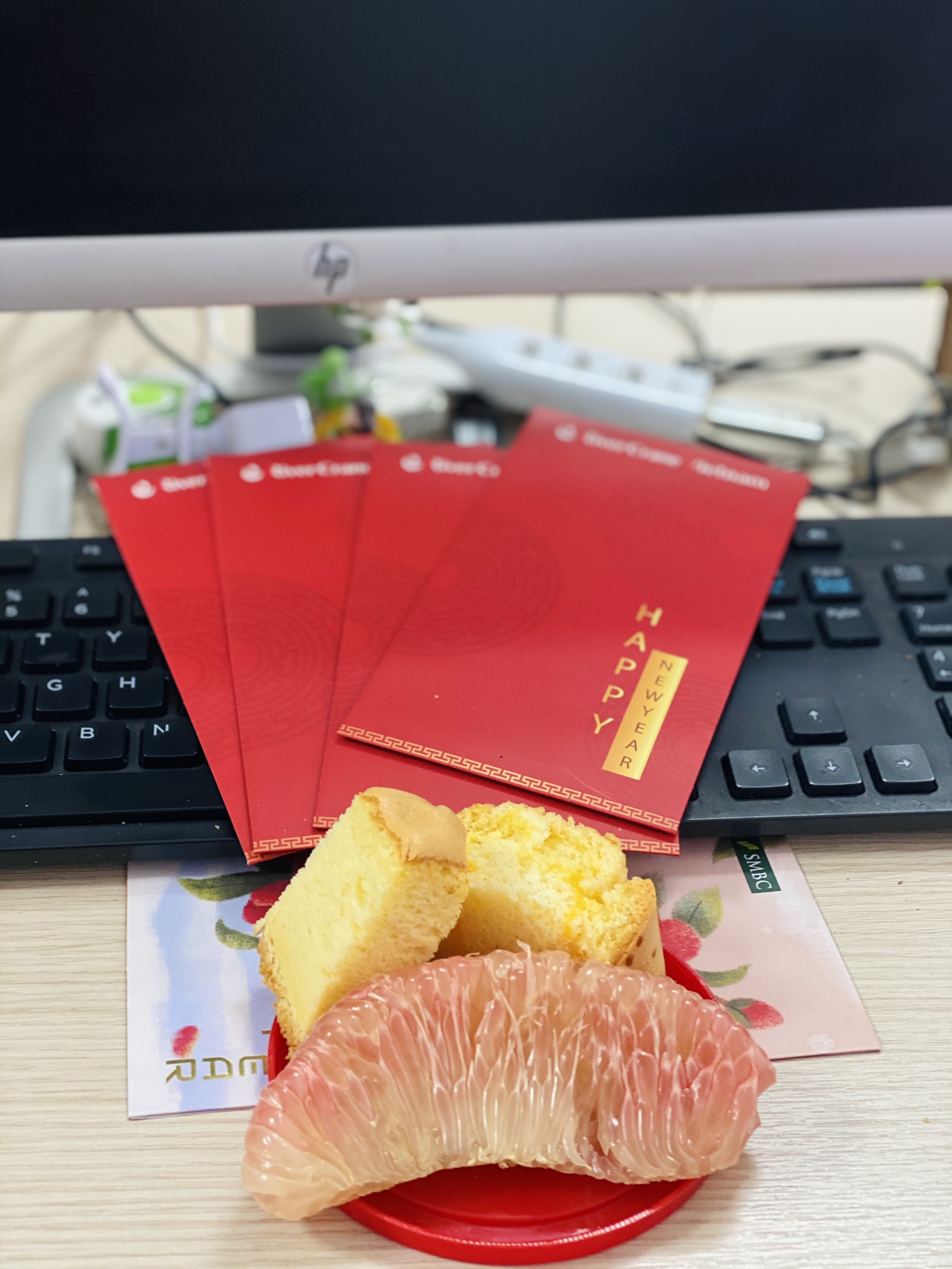 Ngày làm việc đầu năm không khí trong văn phòng có vẻ nhộn nhịp hơn, các thành viên bận rộn nhưng trên gương mặt ai cũng tươi vui! Chắc xa nhau lâu quá (những 2 năm cơ mà) làm các thành viên “nhớ” nhau rồi, các bác bên Nhật cũng liên tục réo gọi vì phải chờ đợi bên VN mình ăn Tết quá lâu! Giờ nghỉ giải lao, mọi người cùng nhau nhâm nhi chút bánh trái, trò chuyện rôm rả sau bao ngày xa cách. Hôm nay, nhà RCVN quá chừng sắc màu, đỏ của bao lì xì mang nhiều may mắn, vàng của bánh mang đến tài lộc, hồng của bưởi mang màu hạnh phúc. Ngày làm việc đầu năm cả nhà Rivercrane đã nhận được quá chừng lộc lành.
